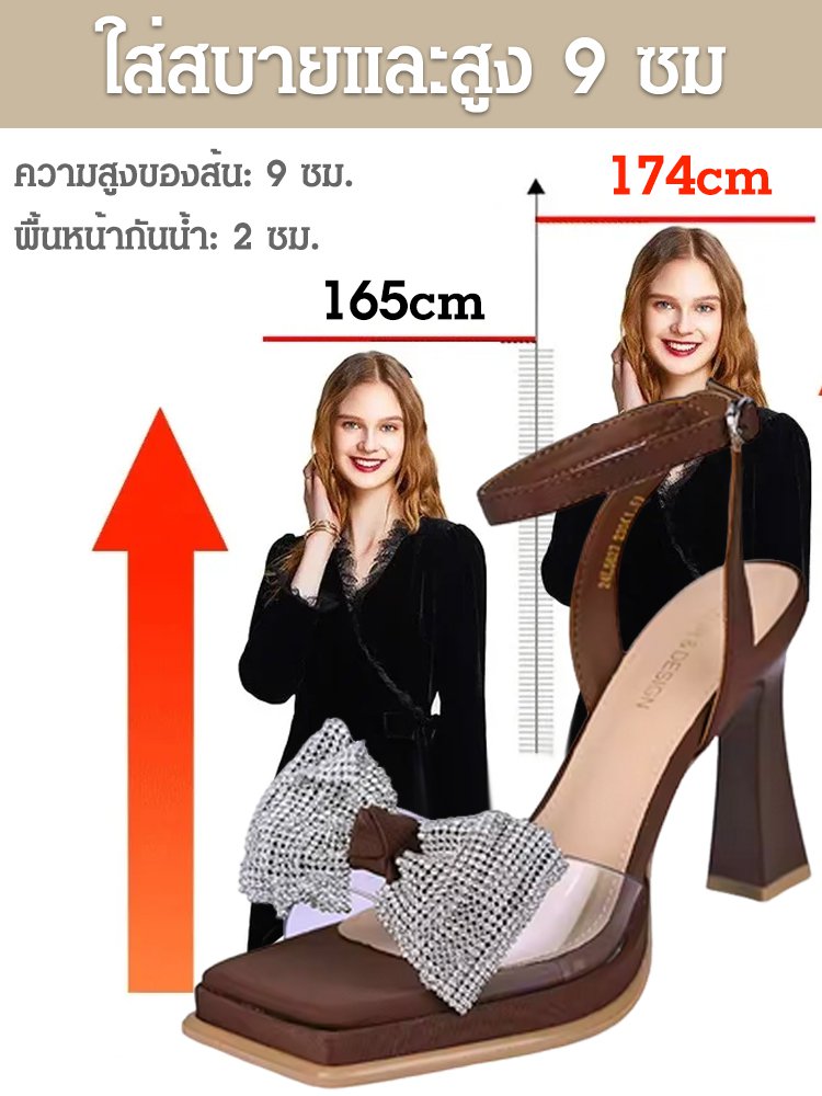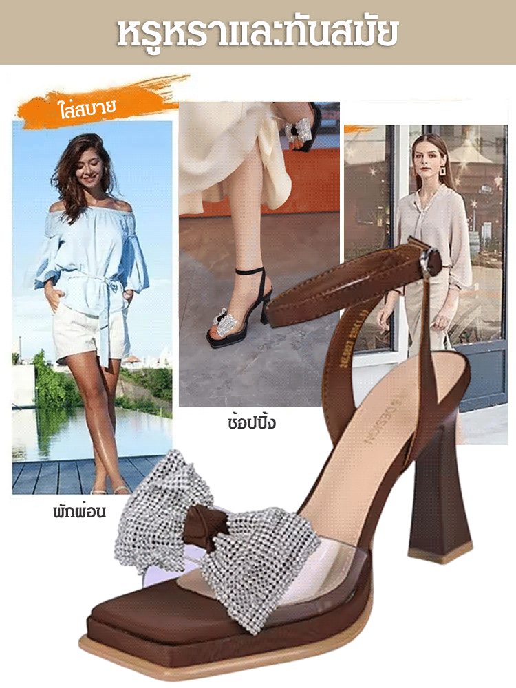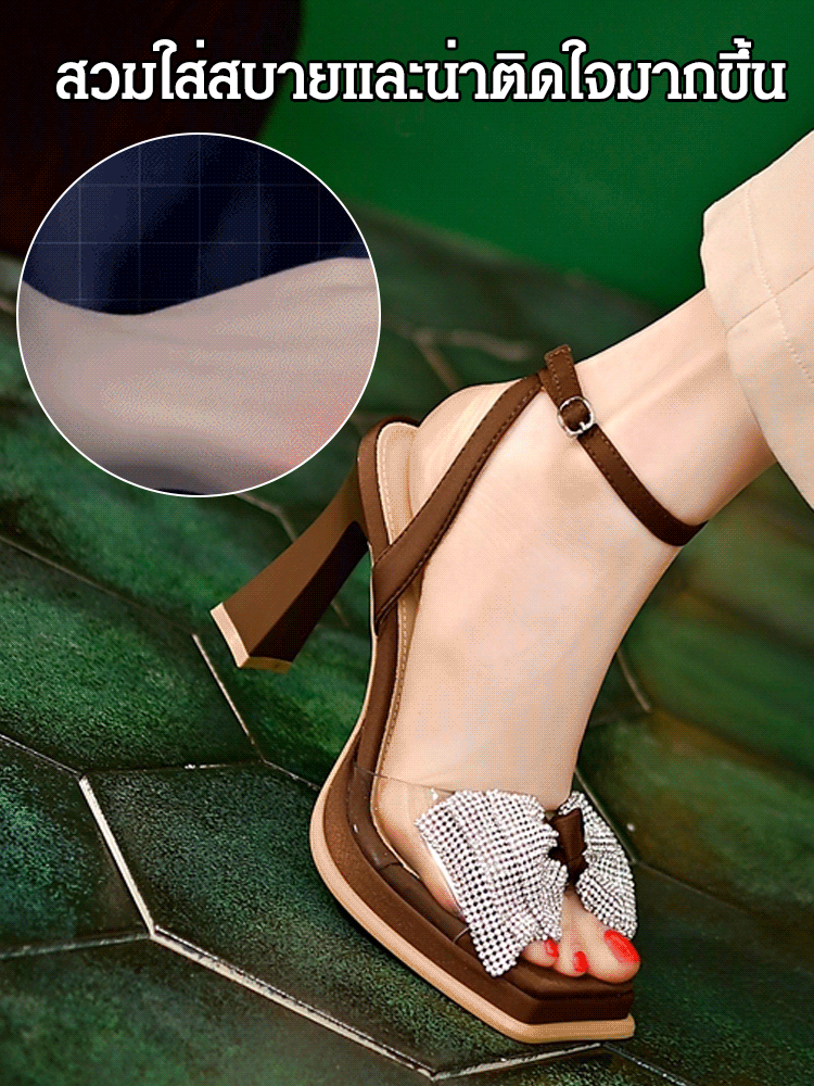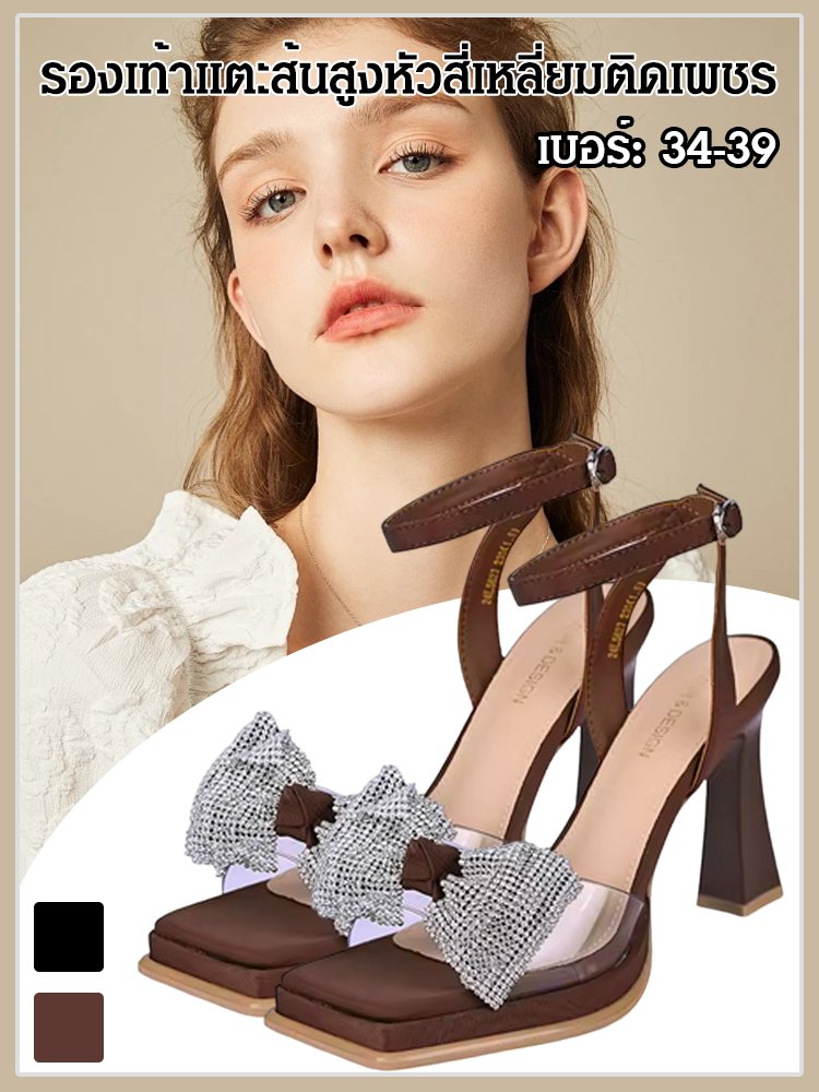 รองเท้าแตะส้นสูงหัวสี่เหลี่ยมติดเพชร